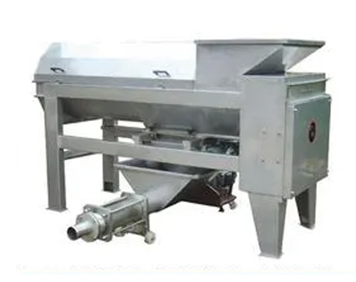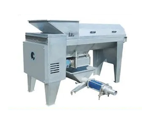 石榴從進(jìn)料斗進(jìn)入上破碎裝置,上破碎裝置將石榴壓開,兩輥間隙為20毫米,然后進(jìn)入下破碎裝置,下破碎裝置再次將石榴擠壓,兩輥間隙為10毫米,經(jīng)過兩級擠壓的石榴已基本皮籽分離,并落入分離裝置,在攪拌軸的攪拌下,石榴籽從篩孔落下,石榴皮從尾部排出,上下破碎輥為彈性結(jié)構(gòu),間隙可調(diào)。石榴籽及汁用螺桿泵送至壓榨機(jī)。