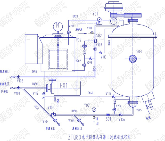 過(guò)濾時(shí),首先在過(guò)濾盤上形成硅藻土預(yù)涂層。被過(guò)濾的液體經(jīng)硅藻土預(yù)涂層時(shí),其中的雜質(zhì)即被阻擋;而純靜的液體經(jīng)過(guò)微觀管狀或片狀的間隙以及顆粒之間的間隙通過(guò)過(guò)濾層,從而起到過(guò)濾作用。隨過(guò)濾時(shí)間的推移,在預(yù)涂層上被濾掉的雜質(zhì)會(huì)越來(lái)越多,且將阻塞過(guò)濾通道。因此在過(guò)濾過(guò)程中,還需對(duì)進(jìn)入過(guò)濾罐的被過(guò)濾的液體,添加一定劑量相應(yīng)粒度的硅藻土,以維持正常的過(guò)濾過(guò)程。另外,如果過(guò)濾時(shí)需要脫色,還需加入一定比例的活性炭。